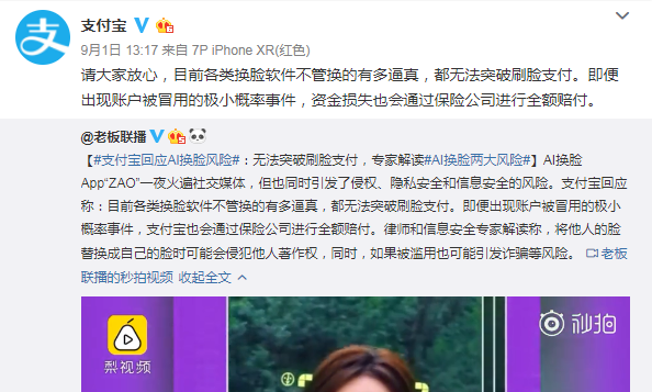 對此,9月1日,支付寶方面回應稱:目前各類換臉軟件不管換的有多逼真,都無法突破刷臉支付。即便出現賬戶被冒用的極小概率事件,支付寶也會通過保險公司進行全額賠付。