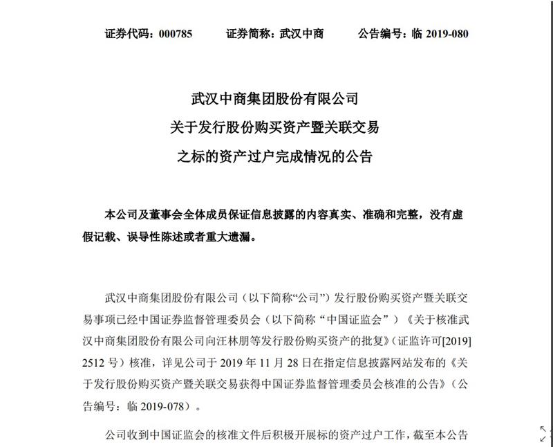 10月18日,武漢中商再次發布公告表示,武漢中商與北京居然之家家居新零售連鎖集團有限公司的重組事項獲中國證監會有條件通過,公司股票將自10月18日起復牌。