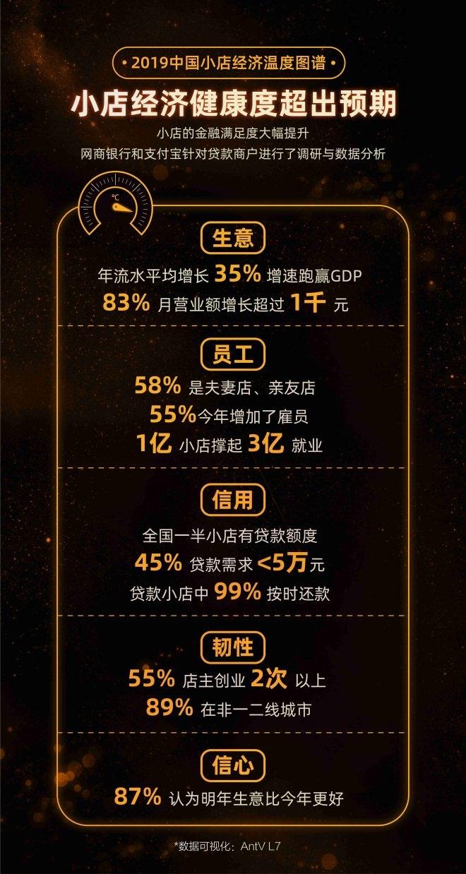 網商銀行和支付寶對貸款商戶進行了數據分析,他們的流水平均增長35%,增速跑贏GDP,超過一半加了員工,擴大了經營,更值得一提的是,99%的小店都做到了按時還款,體現出極高的發展健康度和信用水平!