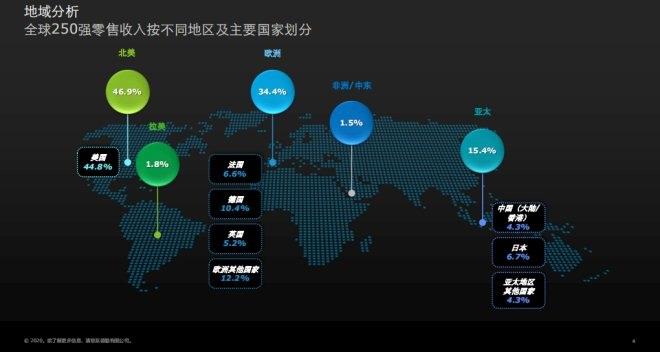 在全球250強零售商地域分布上,亞太地區共有61家零售商上榜,占到總榜單的15.4%。