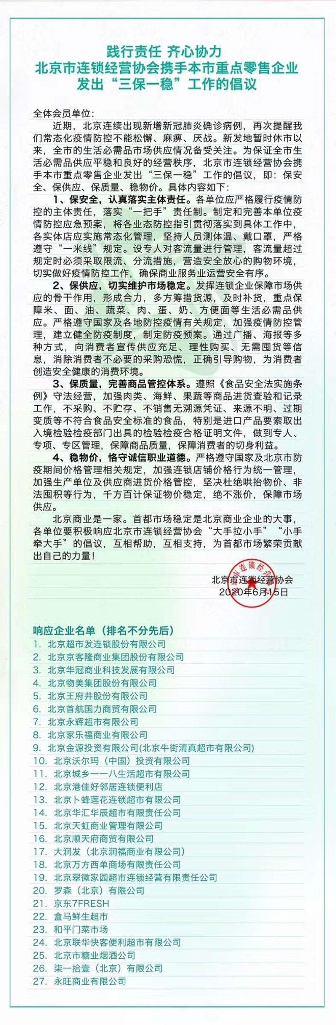 倡議二:《踐行責任 齊心協力北京市連鎖經營協會攜手本市重點零售企業發出“三保一穩”工作的倡議》