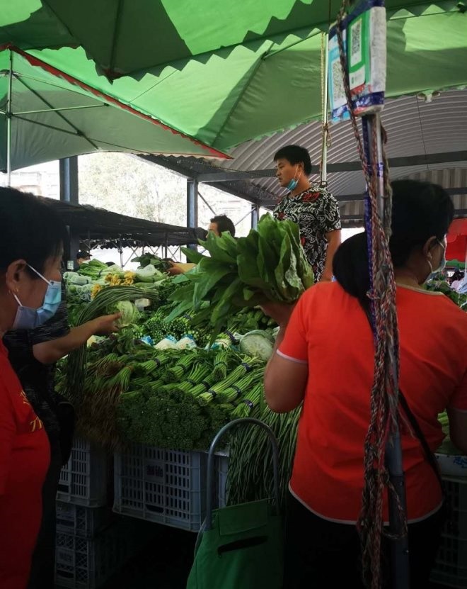 雙峪市場的大門不是很顯眼,但是往里走就是另一番天地。這里按照產品種類進行了銷售區域劃分,有水果大廳、蔬菜大廳、肉類大廳、服裝大廳,周圍一些小門店都是日用百貨店,分為雜貨區、調料區、主食區,還有服裝加工、配鑰匙等便民服務。蔬菜大廳最為熱鬧,商販們的叫賣聲此起彼伏,人們拉著各種小推車在菜攤前挑選商品,時不時地還能碰到街坊鄰居打個招呼。這里的煙火氣最為濃烈。