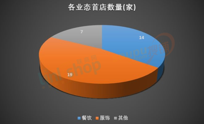 從首店業態來看,服飾鞋履19家,餐飲業態14家,兒童業態2家,美妝2家,生活服務1家,配飾1家,箱包 1家。由此可見,服飾和餐飲首店占比超八成,是品牌首店最多的業態,也是最容易創新并出成績的熱門業態。