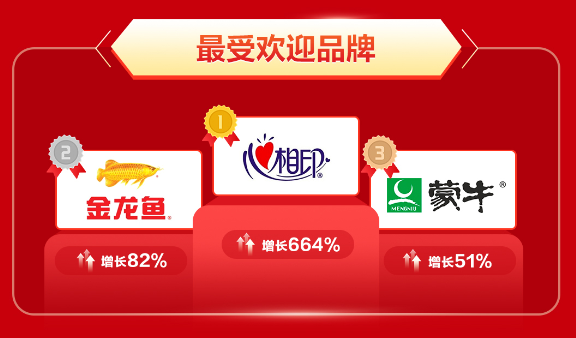 戰報顯示,心相印、金龍魚及蒙牛成為本次最受消費者喜愛的品牌。其中心相印銷售額增長達664%。
