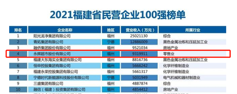福建省企業百強榜單參照“中國企業500強”標準,是福建省經濟建設成果的重要展示。本次百強入圍門檻是35.41億元,比上年增加17.41億元,增幅接近翻倍。永輝憑借931.99億的年營收位列榜單第4名。