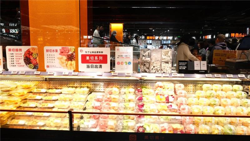 在永輝,鮮度與價(jià)格形成透明對(duì)話。貨架上的折價(jià)標(biāo)簽不再是模糊的促銷手段,而成為鮮度變化的品質(zhì)坐標(biāo),商品經(jīng)歷價(jià)格調(diào)整時(shí),時(shí)間與原因清晰標(biāo)注,構(gòu)建起透明的鮮度追蹤機(jī)制。而針對(duì)果切這類“嬌貴”商品,四小時(shí)后打上八折標(biāo)簽,六小時(shí)則進(jìn)入六折區(qū)間,八小時(shí)后果斷撤離貨架。這種將時(shí)間價(jià)值化的管理機(jī)制,讓消費(fèi)者在挑選時(shí)多了一份安心。“上次買的打折的果切,口感依然清甜如初。”一位顧客分享道。